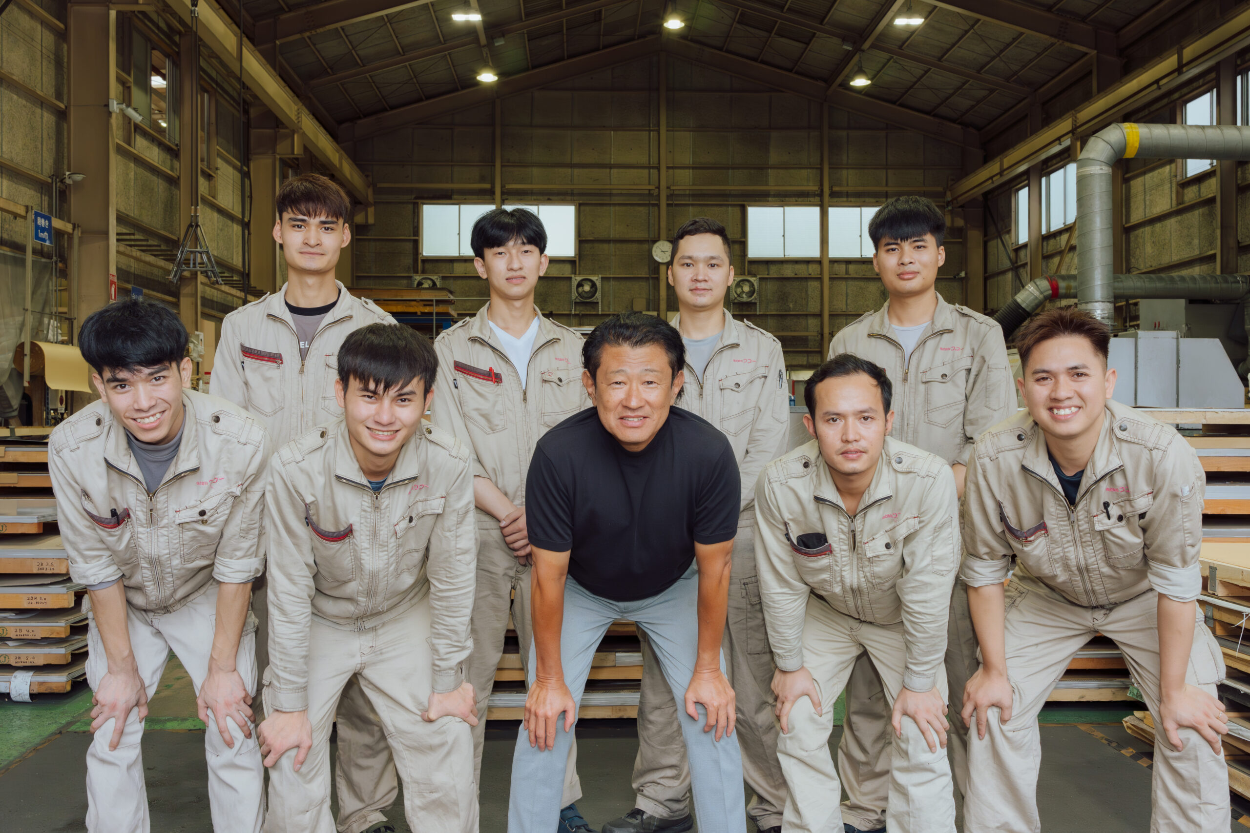 人材不足が深刻化する前から、若手が集まりにくくなるのではないかという危機感がありました。取引先で技能実習生を受け入れている現場を見学した際、彼らの真摯な働きぶりや、それに刺激を受けて成長する日本人社員の姿に可能性を感じ、外国人雇用を決断しました。実際にベトナムへ赴き現地で面接を行ったうえで、初めてベトナム人材を受入れました。現在は、ベトナム人社員 9 名に加え、ナイジェリア人社員 1 名も在籍しています。今後はインドネシア人材 4 名の受入れを予定しており、文化理解に向けた準備も進めています。